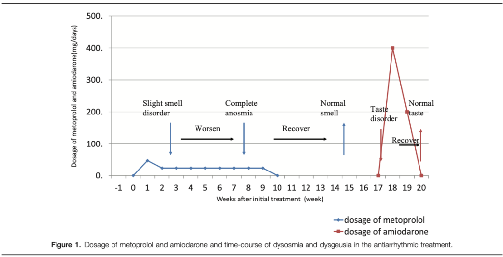 タイトル(原題): Antiarrhythmic drug-induced smell and taste disturbances: A case report and literature review(メトプロロールで嗅覚脱失、アミオダロンで味覚減退を来した1例:抗不整脈薬による稀な感覚障害)
