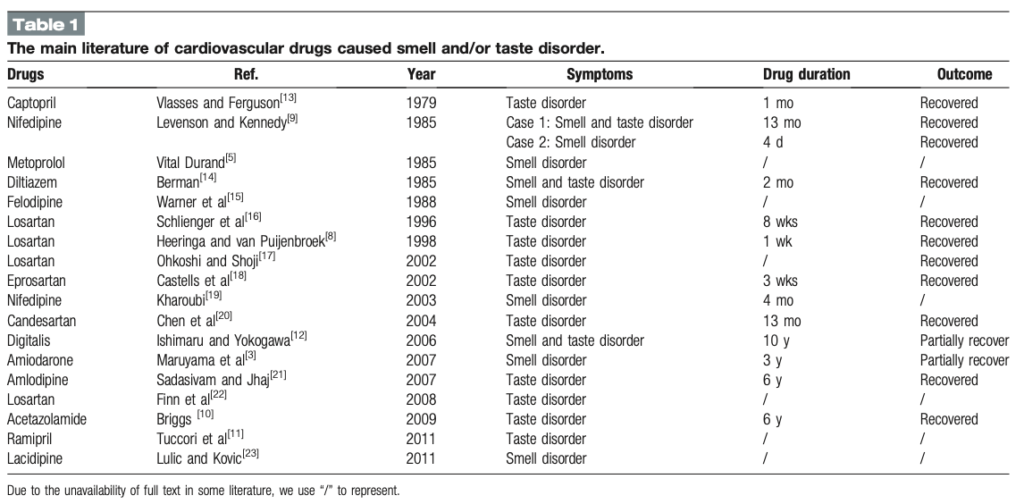 (Table1は『嗅覚・味覚障害を引き起こした主な 循環器用薬 の文献』です。つまり、ここには「抗不整脈薬」だけでなく、高血圧治療などで使われる降圧薬などが広く含まれています。実際にTable 1のリスト内訳を見ると、大部分が抗不整脈薬以外です)
