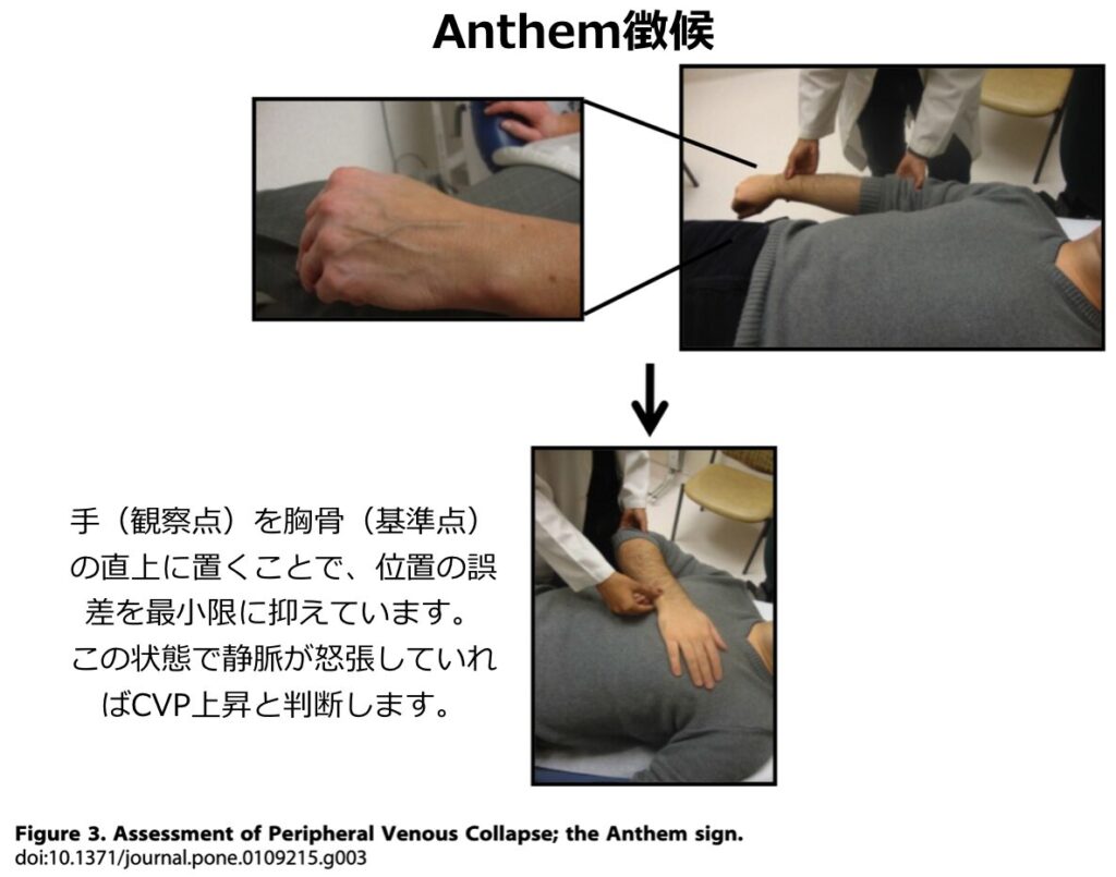 Anthem徴候は、中心静脈圧(CVP)の上昇をベッドサイドで簡易的に評価するための新しい身体所見です(Rizkallah et al., 2014)。
