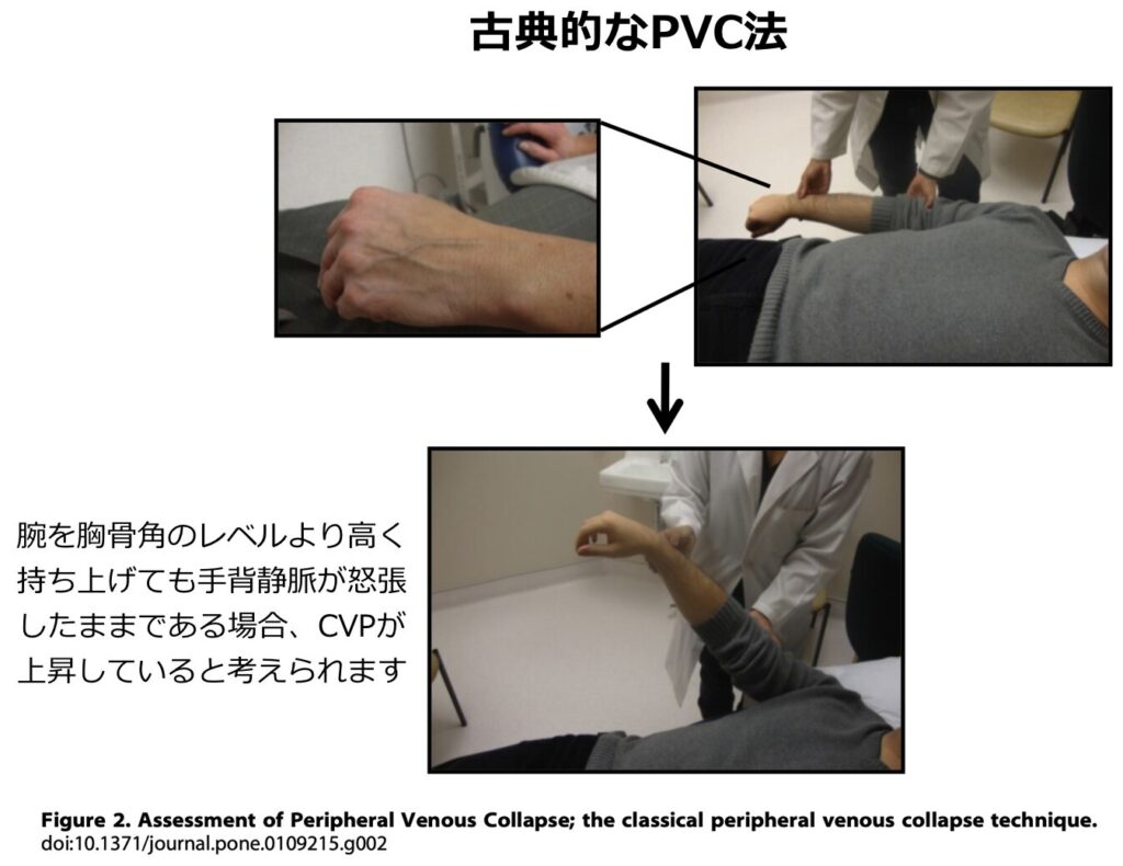 古典的なPVC法は頸静脈(JVP)の観察が難しい場合に、手背静脈を用いて中心静脈圧を非侵襲的に推定する方法です。