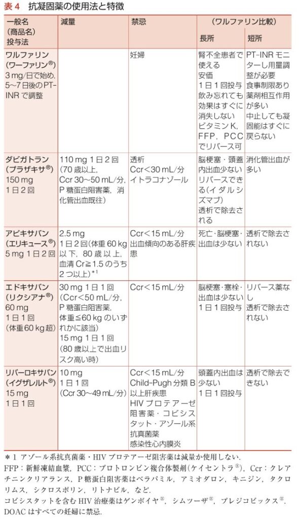 - ただし,DOAC は妊娠中,授乳中,僧帽弁狭窄症・人工弁,高度腎機能障害・透析患者,抗リン脂質抗体症候群では使用しない.