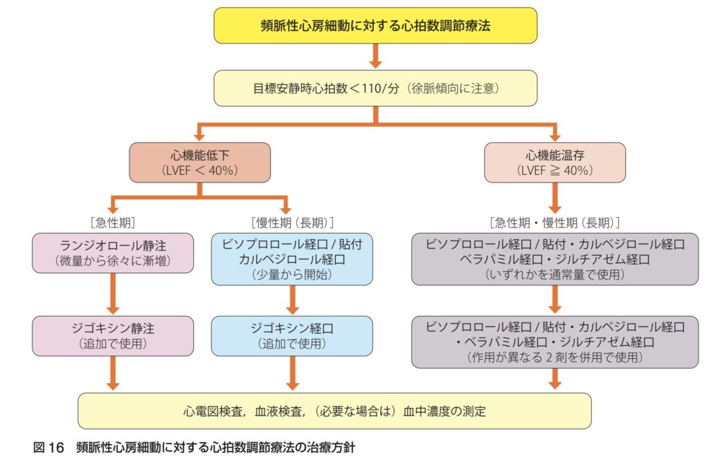 - 注意点: 心機能が低下している(LVEF 40%以下)患者や心不全徴候がある患者には、Ca拮抗薬(ベラパミル、ジルチアゼム)は心抑制作用があるため避けます。その場合はβ遮断薬(少量から)やジギタリス(即効性はないが併用薬として)を選択します。