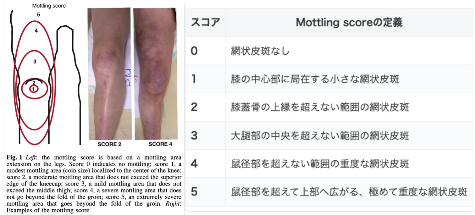 - Mottling Score: 膝蓋骨周辺を中心に出現した網状皮斑が、末梢や中枢に向かってどれくらい広範に広がっているか」を視診で観察し、その広がりの面積によって重症度をスコア化します。広範囲に及ぶほど、微小循環障害が強いことを意味します。