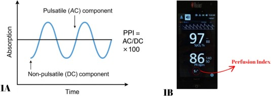 - PPI(Peripheral Perfusion Index): 日本の敗血症診療ガイドラインには記載されてませんが、パルスオキシメーターの波形から、拍動成分(動脈血)と非拍動成分(組織など)の比率を算出したものです。持続的にモニター可能であり、交感神経の緊張や昇圧剤の過剰投与によって微小循環が締め付けられ血流が低下すると、数値が急降下します。