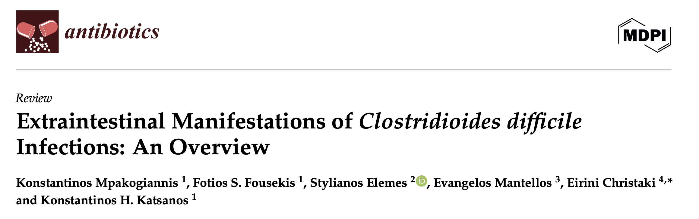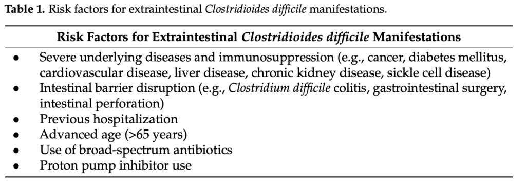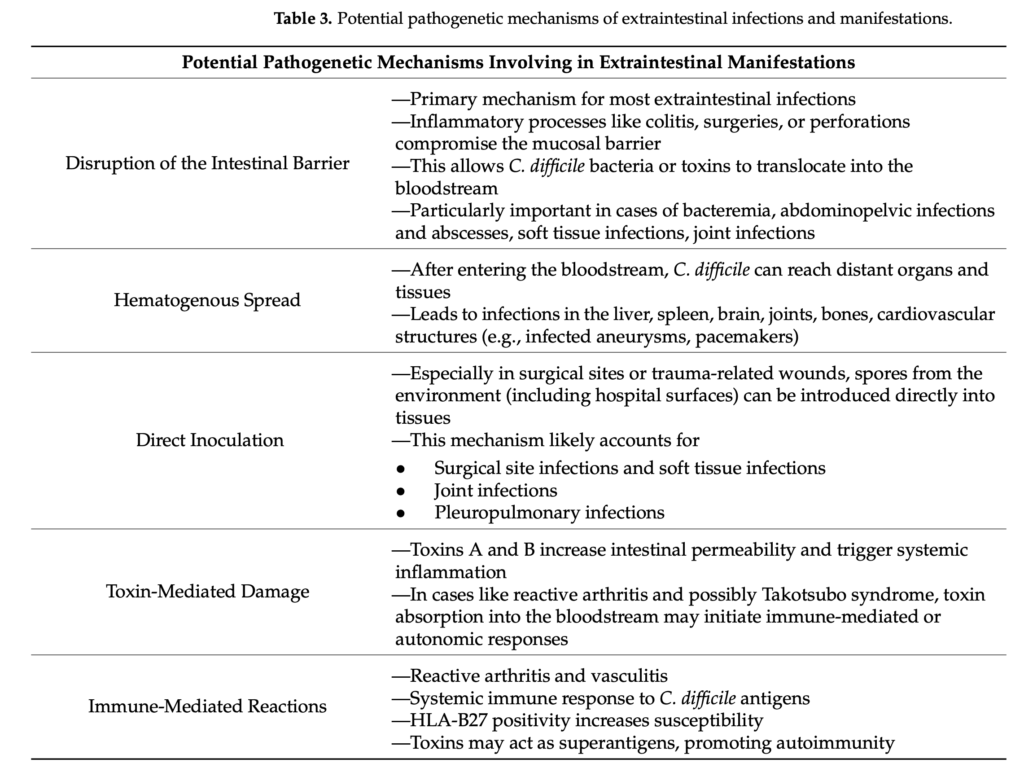 - 「Mpakogiannis, K.; Fousekis, F.S.; Elemes, S.; Mantellos, E.; Christaki, E.; Katsanos, K.H. Extraintestinal Manifestations of Clostridioides difficile Infections: An Overview. Antibiotics 2025, 14, 670. https://doi.org/10.3390/antibiotics14070670」 を参考にまとめました。