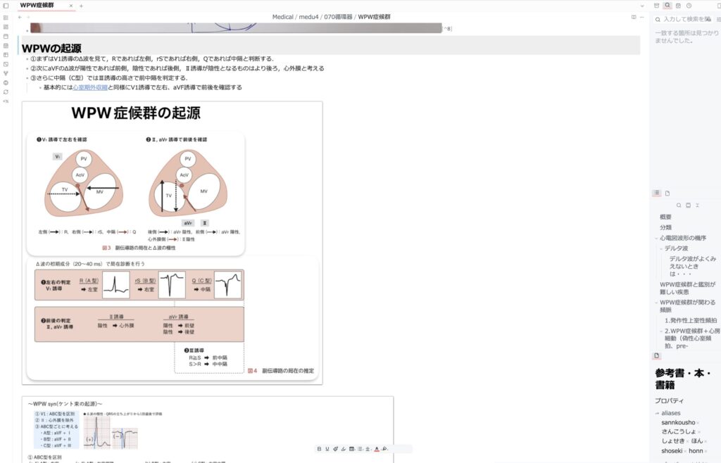 例えば、Obsidian内で「WPW症候群」と検索すると、過去に自分が貼り付けてきたWPW症候群の心電図がずらりと並びます。