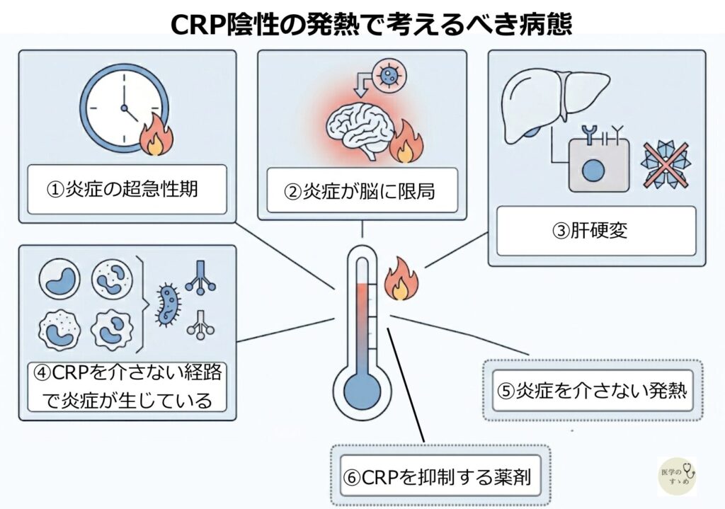 発熱しているのにCRPが上がっていないケース、臨床現場ではちょくちょく出くわしませんか。「おや?」と思う瞬間ですが、以下の6つの病態に当てはめて整理すると、診断の推論がぐっとスムーズになります。