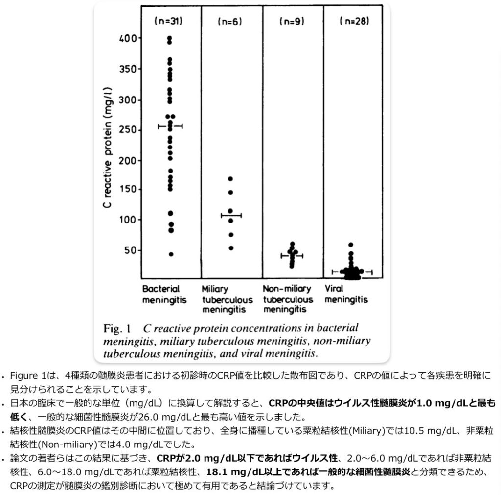 - 以下は各髄膜炎(細菌性髄膜炎、結核性髄膜炎(粟粒性・非粟粒性)、ウイルス性)、おけるCRP値を計測した論文です。