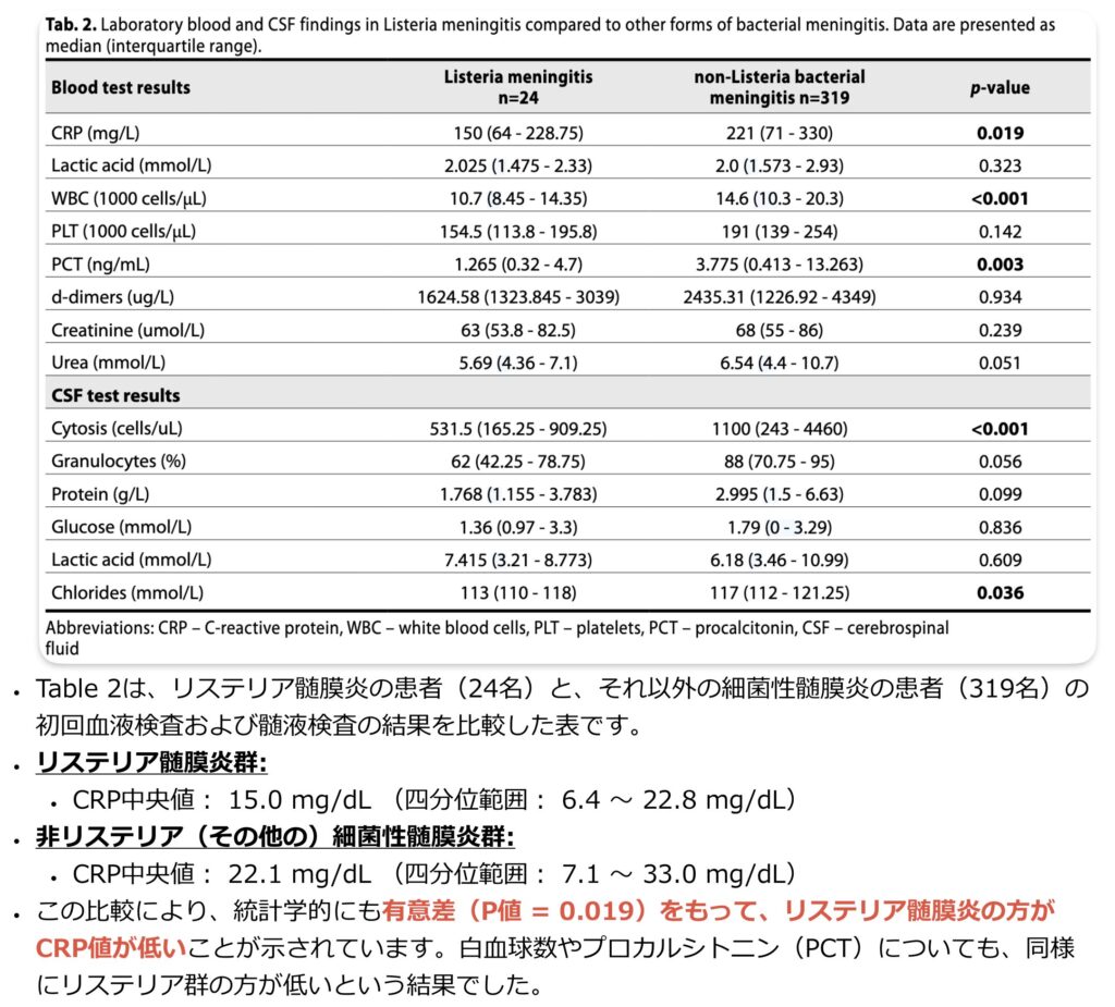 - 以下の論文は、成人のリステリア髄膜炎が他の細菌性髄膜炎と比較して免疫抑制療法を受けている患者に特異的に多く発症し、CRPや白血球数などの炎症マーカーが有意に低値を示すことを明らかにした後ろ向き臨床研究です(Neuroendocrinol Lett 2019; 40(2):79–84)。