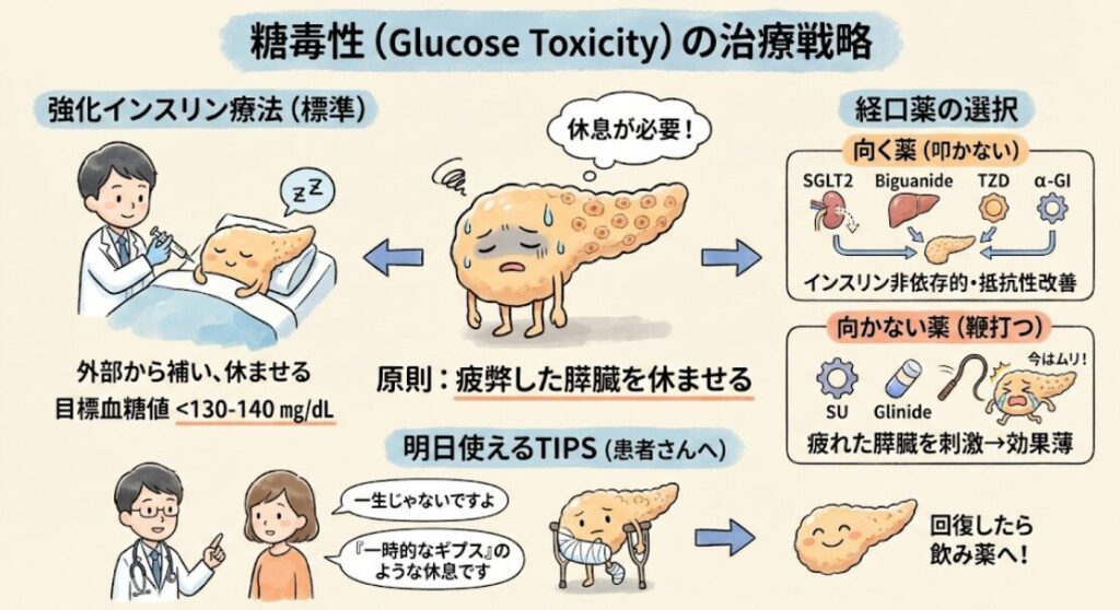 糖毒性(高血糖が膵β細胞を障害し、さらにインスリン分泌能を低下させる悪循環)を断ち切るための絶対原則は、「疲弊した膵β細胞を徹底的に休ませる」ことです。