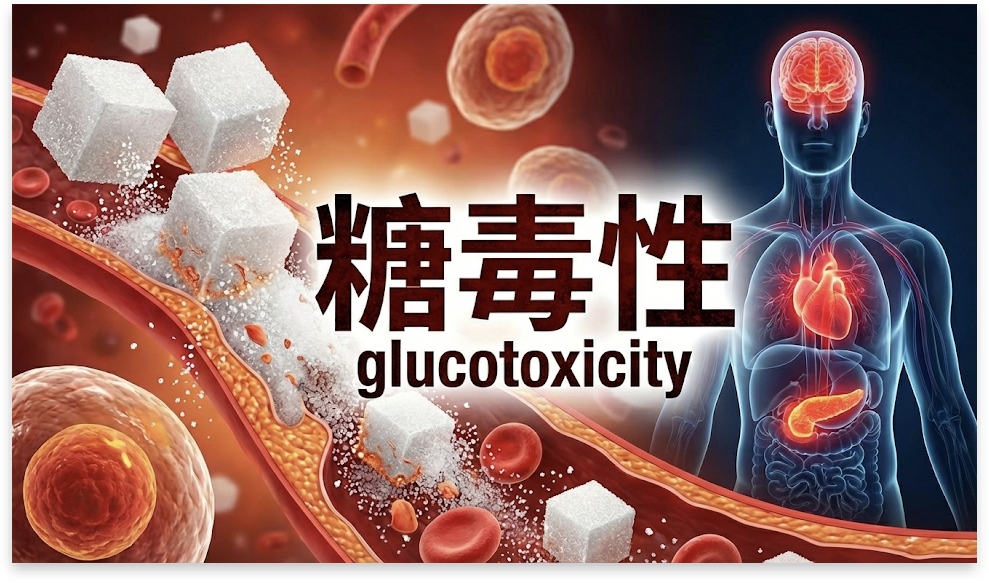 • 糖毒性とは、高血糖状態が持続することによって膵臓のβ細胞が障害を受け、インスリン分泌能が低下し、さらなる高血糖状態を引き起こすという「悪循環」の状態を指します。