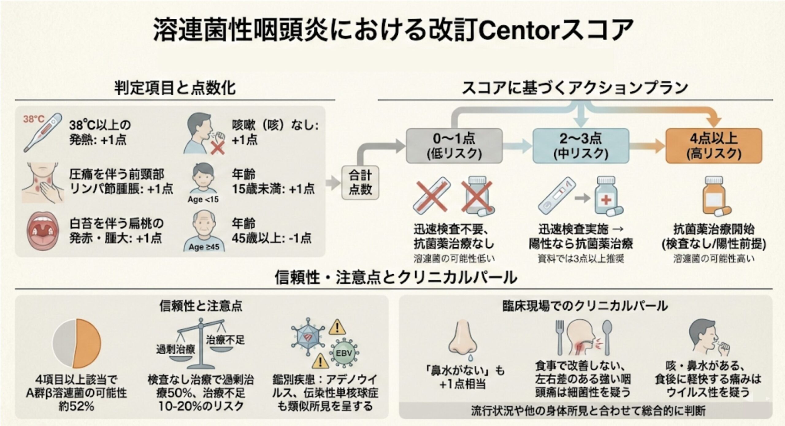 このように、改訂センタースコアは症状の組み合わせから客観的に検査や治療の必要性を層別化するために有用ですが、絶対的なものではないため、流行状況や他の身体所見と合わせて総合的に判断されます。