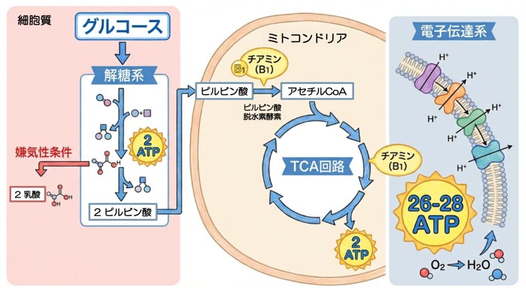 • チアミン(ビタミンB1)欠乏: チアミンはピルビン酸をエネルギーに変える酵素(ピルビン酸脱水素酵素)の補酵素です。これが不足すると(例:ビタミン補充なしの高カロリー輸液施行時など)、好気的代謝が止まり乳酸が蓄積します。