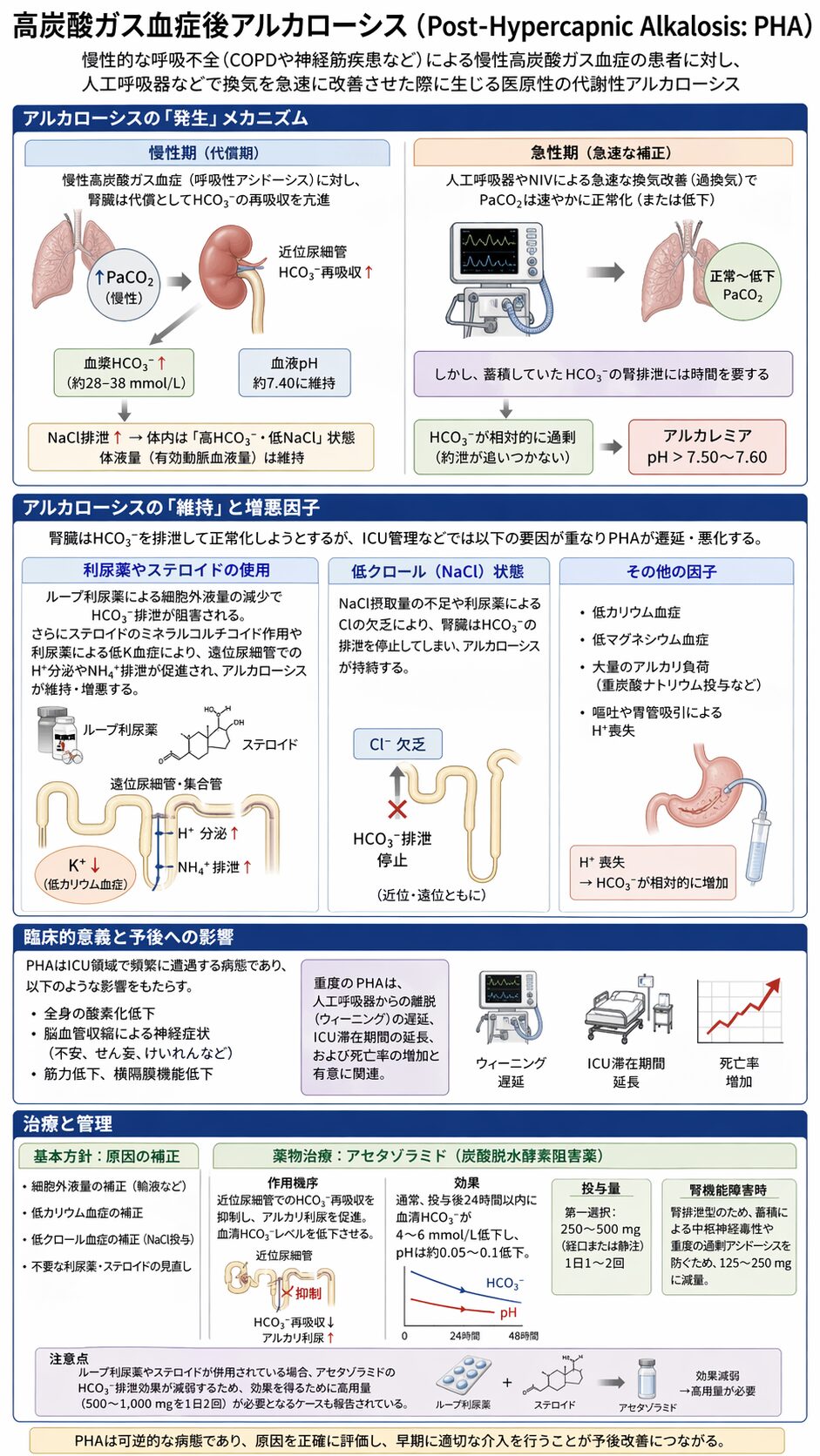 ■高炭酸ガス血症後アルカローシス(Post-Hypercapnic Alkalosis: PHA)とは、慢性的な呼吸不全(COPDや神経筋疾患など)による慢性高炭酸ガス血症の患者に対し、人工呼吸器などで換気を急速に改善させた際に生じる医原性の代謝性アルカローシスです。