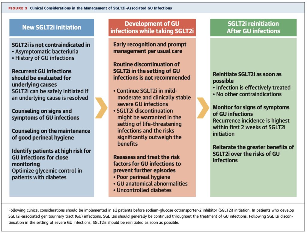 • 「原則継続」の推奨: 軽症〜中等症の尿路感染症が発生しても、通常の抗菌薬治療を行いながらSGLT2iを継続できる。